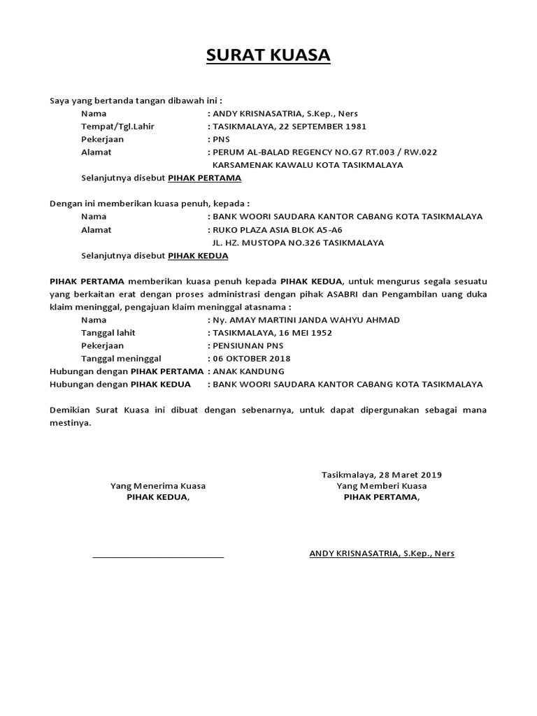 Contoh surat kuasa pengurusan bank. Contoh Surat Kuasa Pembukaan Rekening | Mau buka rekening baru di Bank, tapi berhalangan untuk mengurusnya sendiri. Tidak usah bingung, sebetulnya Anda bisa meminta bantuan orang lain untuk mewakili Anda dalam mengurus pembukaan/pembuatan rekening Bank Anda tersebut melalui surat kuasa pembukaan rekening. Tapi jika Anda ingin buka sendiri, maka gunakan surat dibawah ini: 5. Surat persetujuan alih kredit yang akan dituangkan dalam SK Alih Kredit akan dikirimkan ke alamat yang mahasiswa yang bersangkutan, jadi mohon alamat yang kita tulis di form Alih Kredit jangan sampai salah ya., contoh hasil SK alih kredit yang sudah jadi kayak gini nih. Contoh Surat Kuasa Pengurusan ATM Hilang atau Terblokir - Kehadiran Anjungan Tunai Mandiri (ATM) memang sangat membantu para nasabah bank.Nasabah bank dapat mengambil uang tunai, mengecek saldo, transfer dan transaksi lainnya tanpa harus datang ke kantor cabang bank yang kemungkinan akan mengalami antre panjang. Rincian contoh surat kuasa rekening atm 11 Contoh Surat Kuasa. Contoh Surat Kuasa Untuk Mengurus ATM Terblokir atau Hilang Kartu ATM merupakan salah satu kartu yang penting dan tentunya.