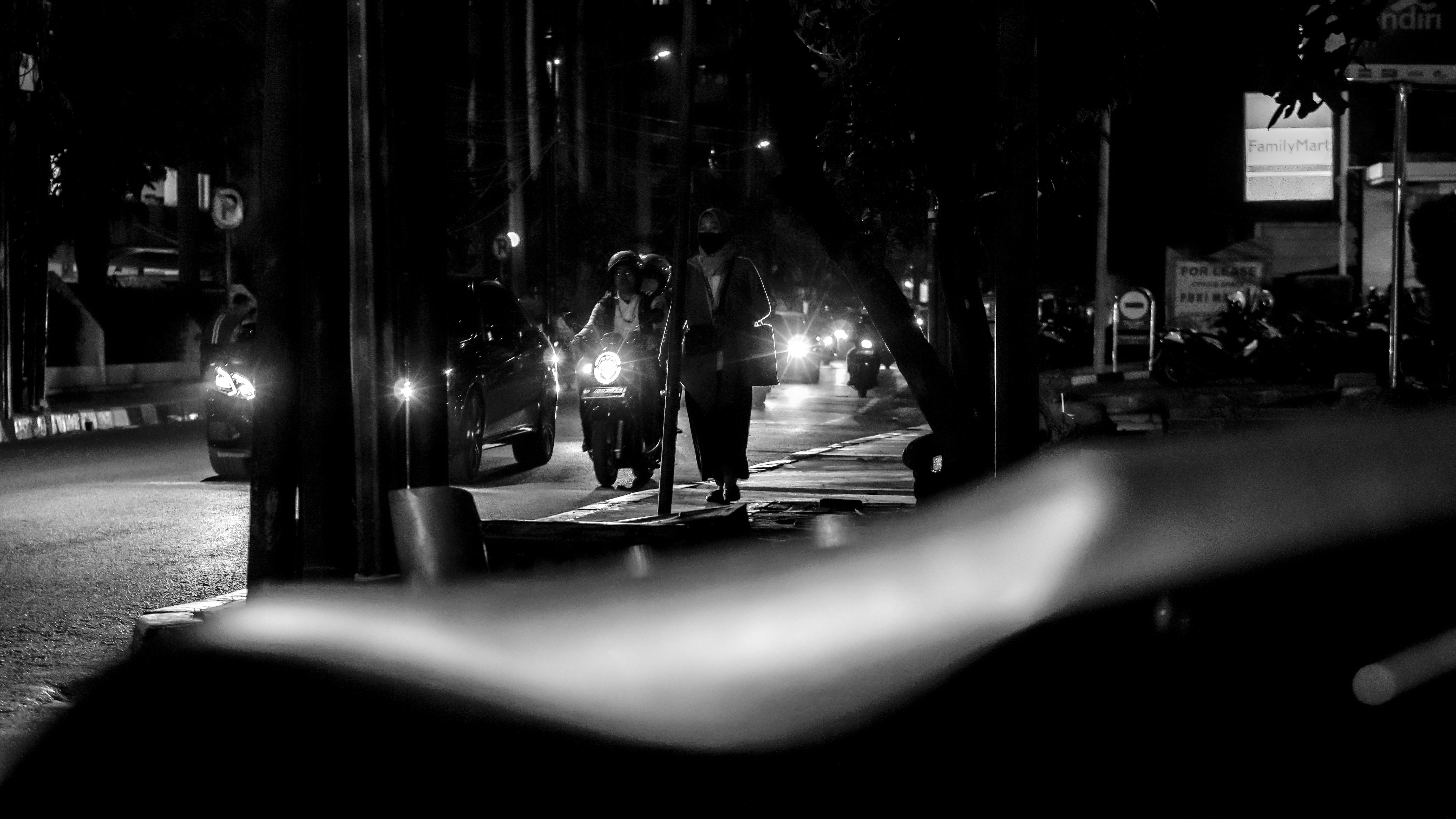 At night on the sidewalk of Jakarta. From a distance, a woman was seen walking home. Her languid face was covered by a mask to avoid breathing dirty air that covers Jakarta all day long.