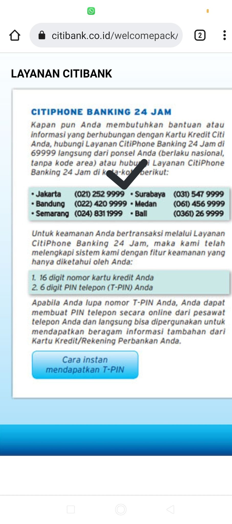 Gimana ya cara cek jumlah tagihan kartu kredit Citibank ... Mayang. Cara cek jumlah tagihan kartu kredit Ctibank ; 1. Citimobile : dengan aplikasi Citibank Indonesiai di ponsel, download di google play atau app store. 2. Citibank Online, melalui situs resmi Citibank. 3. SMS ke 69999 dengan format: Saldo (spasi)4 digit terakhir kartu kredit. 4, Telepon ke nomor (021) 2529999.