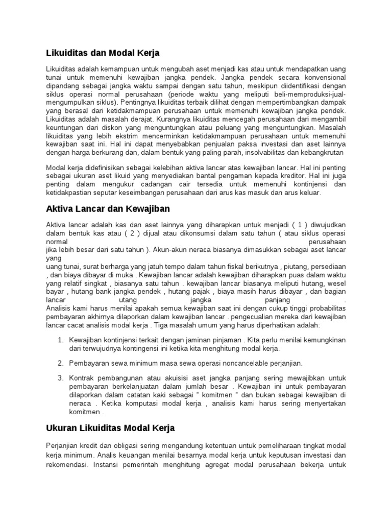 PDF Analisa Kredit - Stie-igi analisis laporan keuangan modul 12 analisa kredit tri kurniawati, s.e.,m.ak stie international golden institute jakarta PDF Analisis Laporan Keuangan Berdasarkan pendapat oleh beberapa ahli di atas, maka dapat disimpulkan bahwa analisis laporan keuangan adalah menguraikan pos-poslaporan keuangan yang melibatkan neraca dan laba rugi untukmendapatkan informasi kondisi keuangan suatu perusahaan lebih dalam yang sangat penting dalam proses menghasilkan keputusan yang tepat. Analisis Kredit - Pengertian, Perbandingan, Tujuan dan Contoh Analisis kredit adalah jenis analisis yang dilakukan oleh investor atau manajer portofolio obligasi pada perusahaan atau entitas penerbit utang lainnya untuk mengukur kemampuan entitas dalam memenuhi kewajiban utangnya. Analisis kredit berupaya mengidentifikasi tingkat risiko gagal bayar yang sesuai terkait dengan investasi pada entitas tertentu. Training Analisa Laporan Keuangan Untuk Analis Kredit ... Karenanya analis kredit perlu untuk mampu melakukan analisa laporan keuangan nasabahnya secara tepat agar dalam hal bank/ lembaga keuangan non Bank mengambil keputusan yang menyangkut pemberian kredit, perpanjangan, rescheduling maupun tindakan lainnya dapat dilakukan dengan baik.